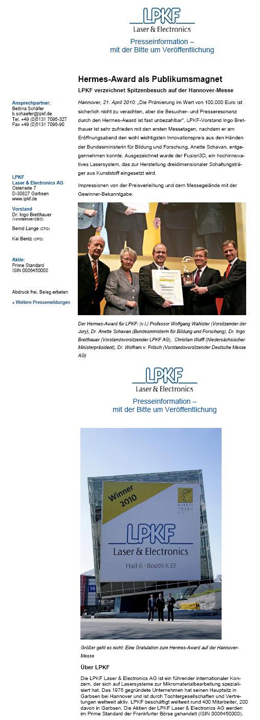 LPKF mit dem Hermes Award 2010 prämiert­