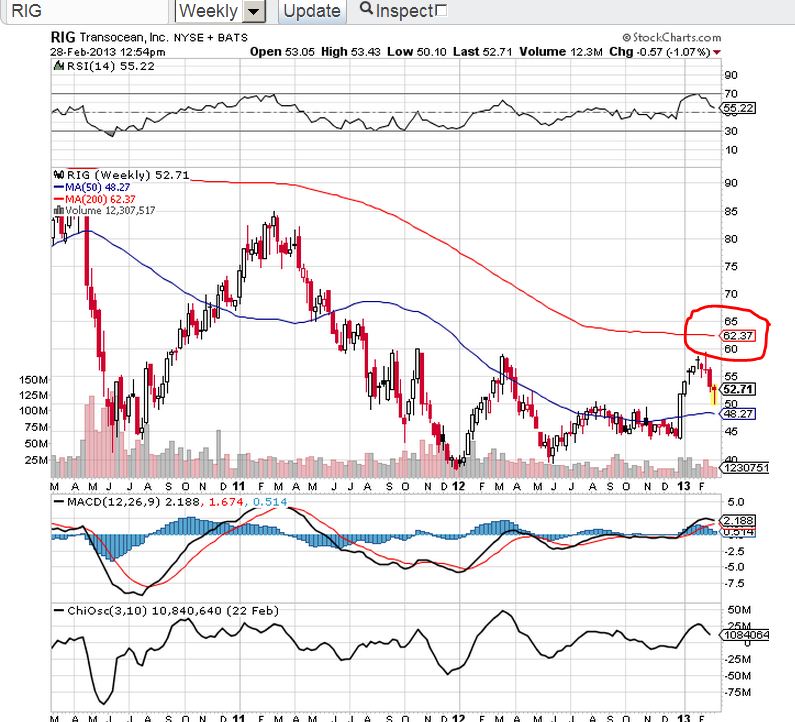 The stock closed yesterday at $51.24 on volume of 3.3 million shares, below average daily volume of 3.9 million.Potential upside of 22.1% exists for Transocean, based on a current level of $51.24 and analysts' average consensus price target of $62.57. The stock should find resistance at its 50-day moving average (MA) of $52.46, as well as support at its 200-day MA of $47.48.