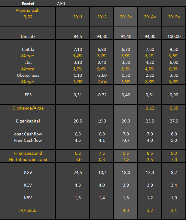 Umsatzprognose übertroffen, EBITDA am oberen Rand der Prognose, weiteres profitables Wachstum für 2014 angekündigt, das Geschäft läuft hier wie angekündigt auf Schienen. Vor allem sehr gut gefällt mir der operative CF von 7 Mio. Aufgrund der Vorlaufkosten für den Großauftrag waren die Investitionen so hoch das sich kein FCF ergeben hat. Das wird sich nun in 2014 ändern und es wir mindestens ein FCF von 5 Mio erzielt, in 2015 wird man dann 10 Mio EBITDA bzw. locker mal 7 Mio FCF machen. das würde bedeuten Ende 2015 sollte ecotel über eine Nettoliquidität von über 10 Mio verfügen. Aktueller Börsenwert gerade mal 25 das heißt der EV für 2015 läge gerade mal bei 15 Mio. und das bei einem EBITDA von 10 Mio bzw FCF von min 5 Mio. das ist so lächerlich, das ist immer noch ein klarer Verdoppler. Bei der Nettoliquidität werden sie witer fett Aktienrückkaufprogramme machen und schon allein mit denen wird der Kurs in andere Regionen vordringen.