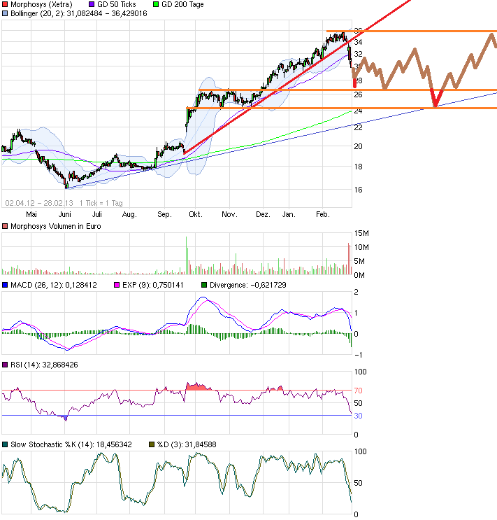 Kann sein dass in der allgemeinen Panik die Unterstützung im Bereich 26/27 kurzzeitig unterschritten wird. Danach sollte aber eine Gegenbewegung kommen, jedenfalls wenn nichts im Busch ist.