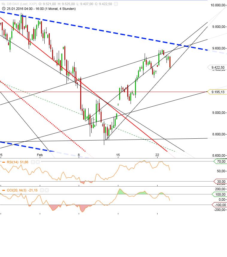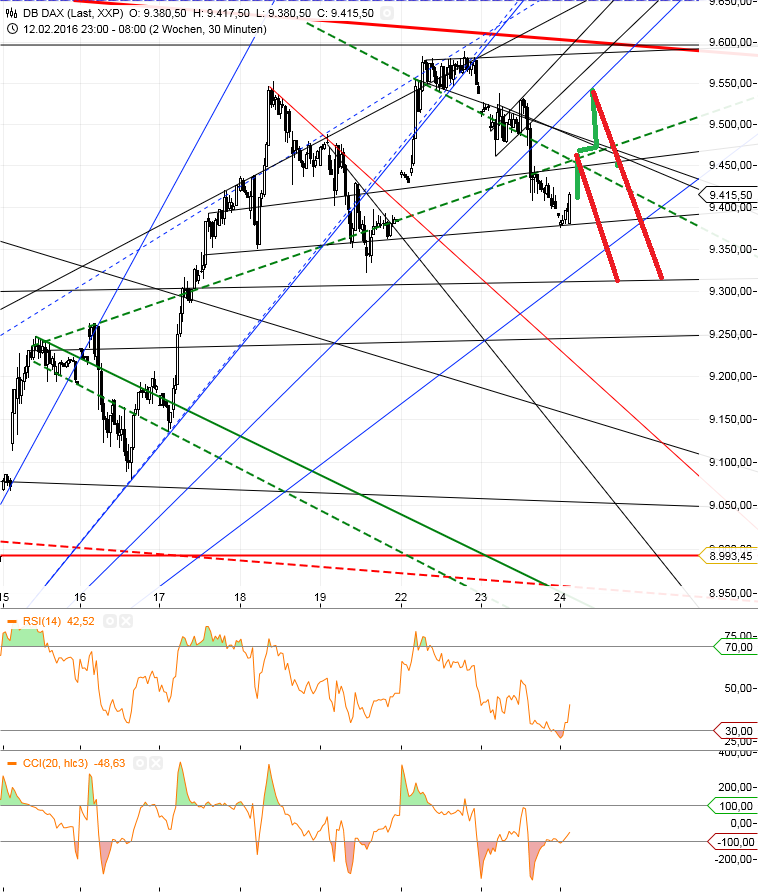 Der Dax ist doch noch gefallen bis zur unteren blauen Fibo-Fächerlinie. Kommt jetzt die Erholung bis zum Ausbruch?