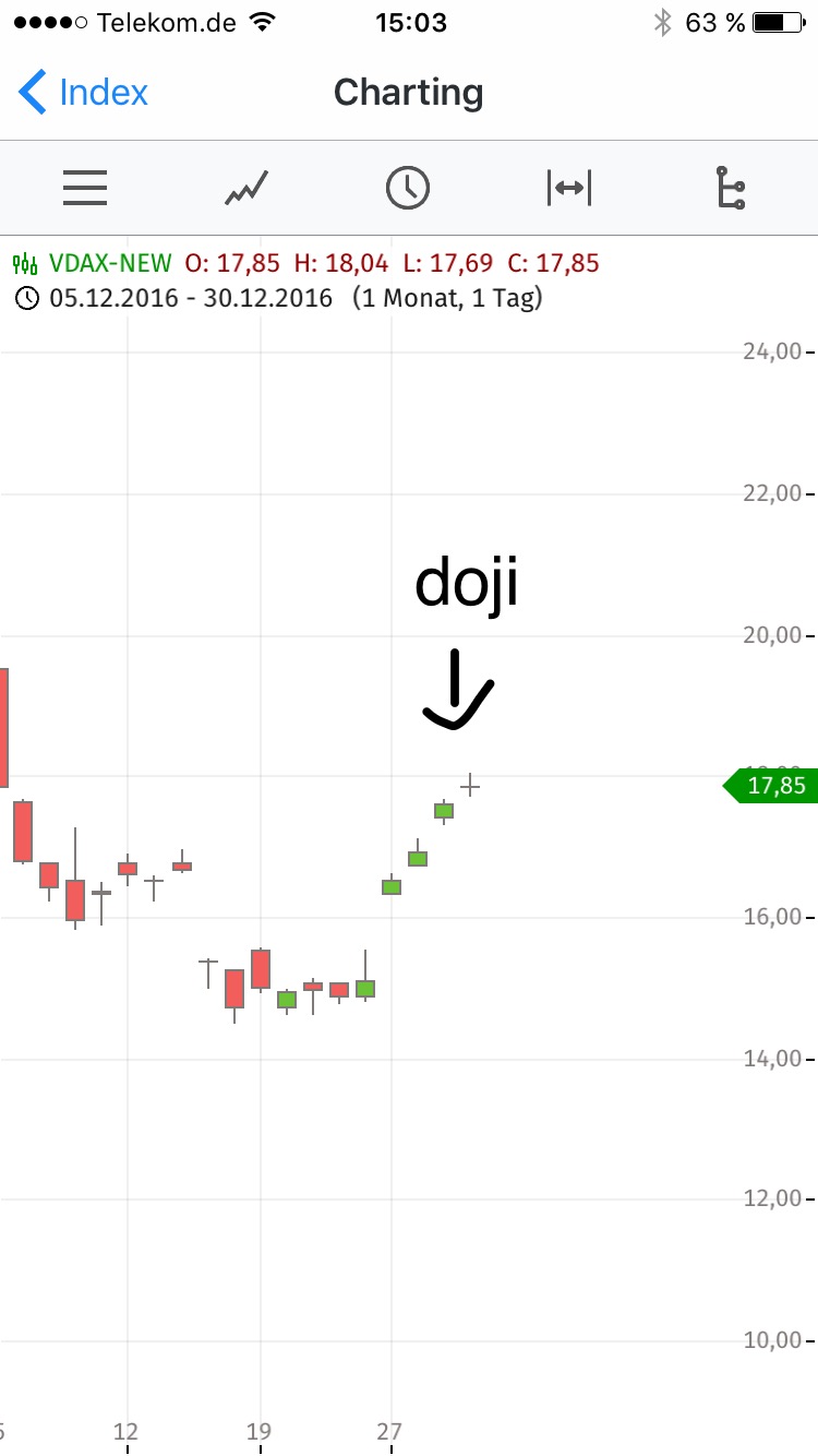Ich fühle mich trotzdem verpflichtet dir zu antworten. Du kannst natürlich auf das rounding top plädieren, aber der ichimoku spricht da etwas anderes. Zudem haben wir im vdax ein ein doji oder "doji Star" (Spitzfindigkeiten) und somit müsste der ab Montag sehr schnell unter 17 sein.