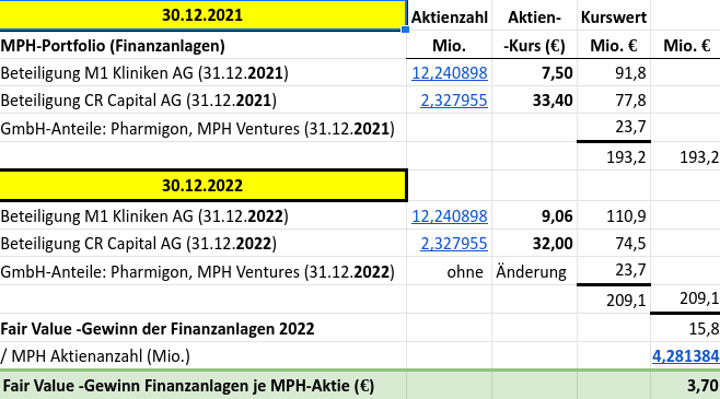 der (buch)gewinn der MPH-finanzanlagen dürfte 2022 bei 3,70 EUR je MPH-aktie liegen, s. tabelle unten (die MPH hat den status einer investmentgesellschaft, die gem. IFRS 10.27 ihre mehrheitsbeteiligungen nicht konsolidieren muss, sondern zum börsenkurs bzw. fair value bewertet, vgl. https://www.haufe.de/finance/merkt-rechnungslegung-nach-hgb-und-ifrs-schaeffer-poeschel/kapitel-14-konzernabschluss-tochterunternehmen-ii-ifrs_idesk_PI37680_HI10255421.html unter b)