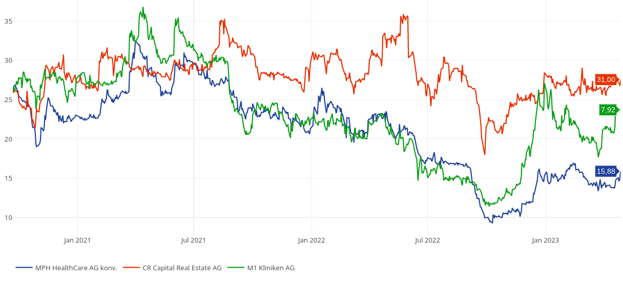 ... der aktie von MPH HEALTH CARE AG (15,88, unten: blau) mit ihren börsennotierten beteiligungen M1 KLINIKEN AG (7,92, unten: grün) und CR CAPITAL AG (31,00, unten: rot) zeigt, wie zurückgeblieben der MPH-kurs immer noch ist (Chart: https://viz.traderfox.com/aktien-vergleiche/DE000A289V03/EI/mph-healthcare-ag-konv/aktien-4763742-2887233):
