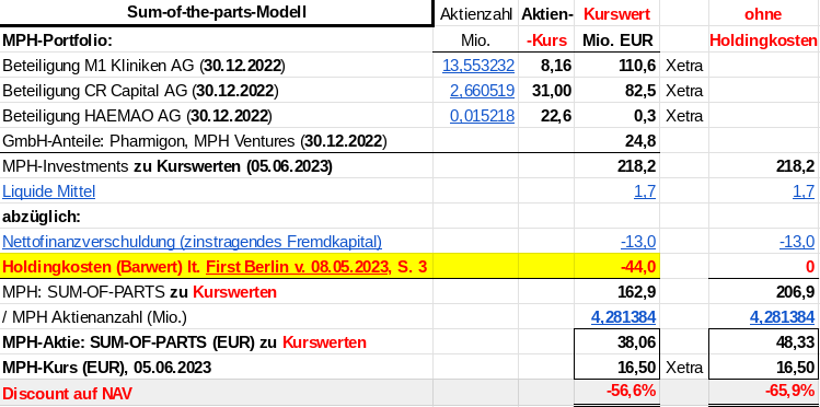 man kann den ((43,91 - 16,25) / 43,91 =)) 63%-discount auf den NAV auch als zusätzliche sicherheitsmarge verstehen, obwohl die MPH-aktie keine sicherheitsmarge bräuchte, weil die hauptbeteiligungen CR Capital und M1 Kliniken auch 2023 florieren