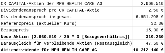 Wie viele neue CR-CAPITAL-Aktien die MPH HEALTH CARE AG erhält, ermittelt sich aus dem Bezugspreis und dem Bezugsverhältnis. Der Bezugspreis wurde vom Vorstand der CR CAPITAL mit Zustimmung des Aufsichtsrats in der Bilanzsitzung vom 17. Mai 2023 auf EUR 15,00 festgesetzt, was ca. 50 % des Schlusskurses der Aktien der CR CAPITAL AG in Euro im XETRA-Handel an der Frankfurter Wertpapierbörse am 23. Mai 2023, also dem Tag vor dem Tag der Festsetzung des Bezugspreises ("Referenzpreis) entspricht. Das Bezugsverhältnis beträgt 25:3. Für die anteiligen Dividendenansprüche aus 25 dividendenberechtigten Aktien, für welche die Aktiendividende gewählt wurde, erhält der Aktionär drei neue Aktien. (https://cr-capital.de/wp-content/uploads/2023/06/0606c8_CR_Capital_AG_FAQ_HV_2023_final18.pdf)