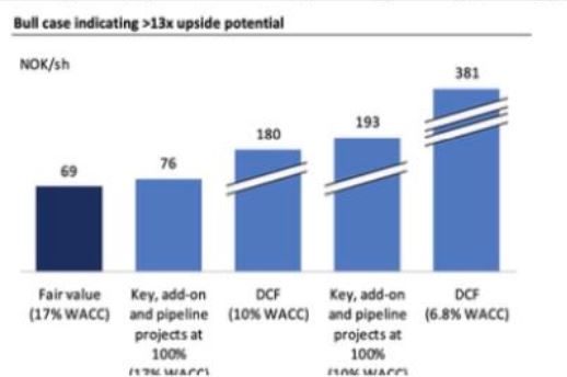 Gestern schloss die Aktie an der Osloer Börse bei 72 NOK, was einem Aufwärtstrend von 45 Prozent entspricht. Das Maklerhaus sieht jedoch einen noch größeren Aufwärtstrend, wenn die Teile zusammenfallen.