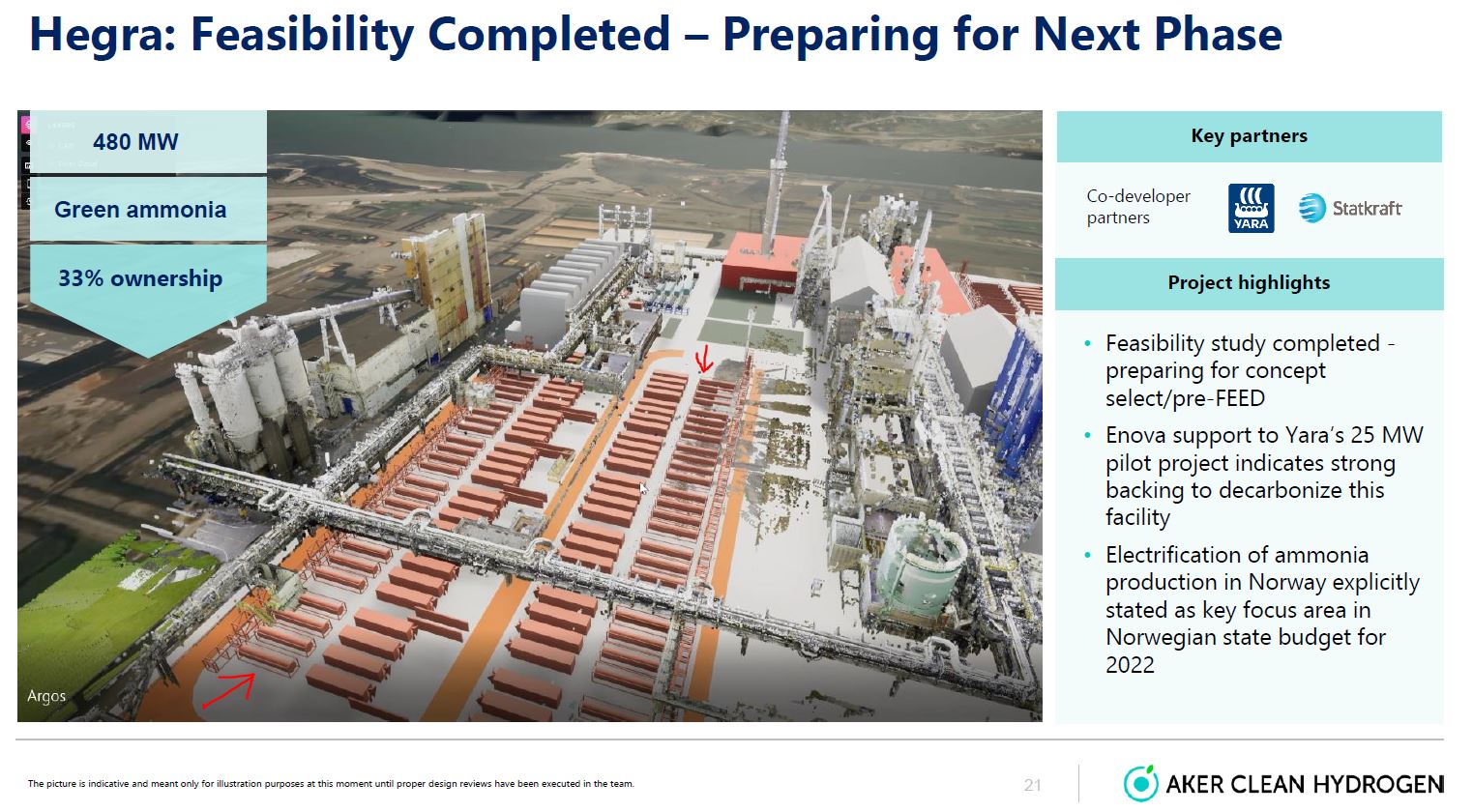 Für das 480 MW green Ammonia wurde «HEGRA» (Abkürzung­ für HErøya GReen Ammonia) gegründet.­ Hegra gehört zu Yara, Aker Clean Hydrogen und Statkraft,­ die jeweils 1/3 besitzen.