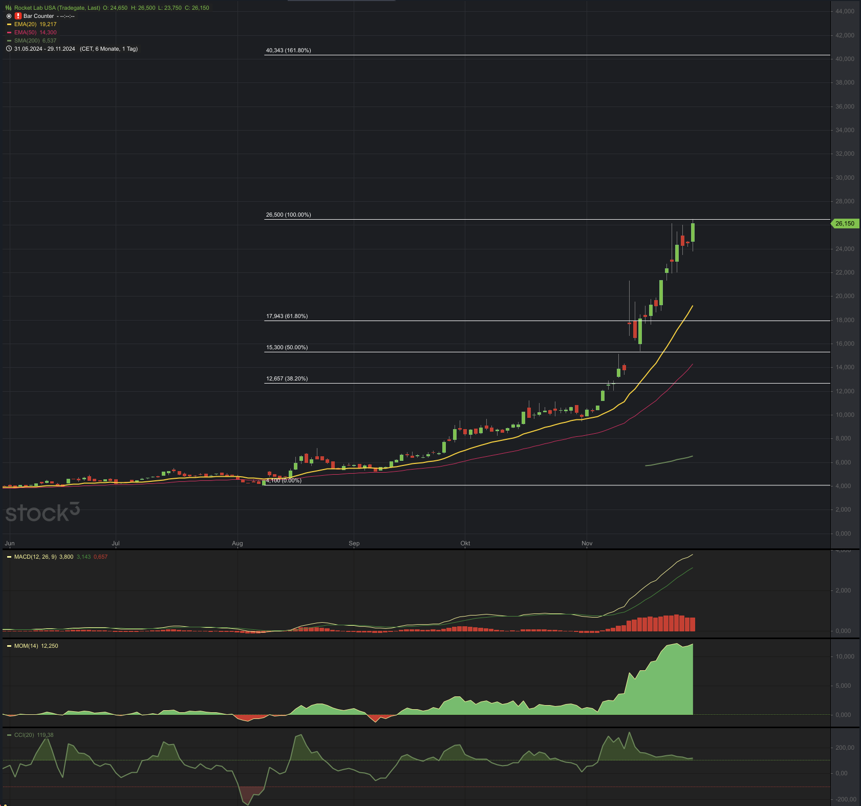Der Kurs hat seit Juni kontinuierlich an Wert gewonnen, wobei die Dynamik im Oktober/November deutlich zunahm. Die gleitenden Durchschnitte (EMA 20 und EMA 50) steigen stark an, was den Aufwärtstrend bestätigt.