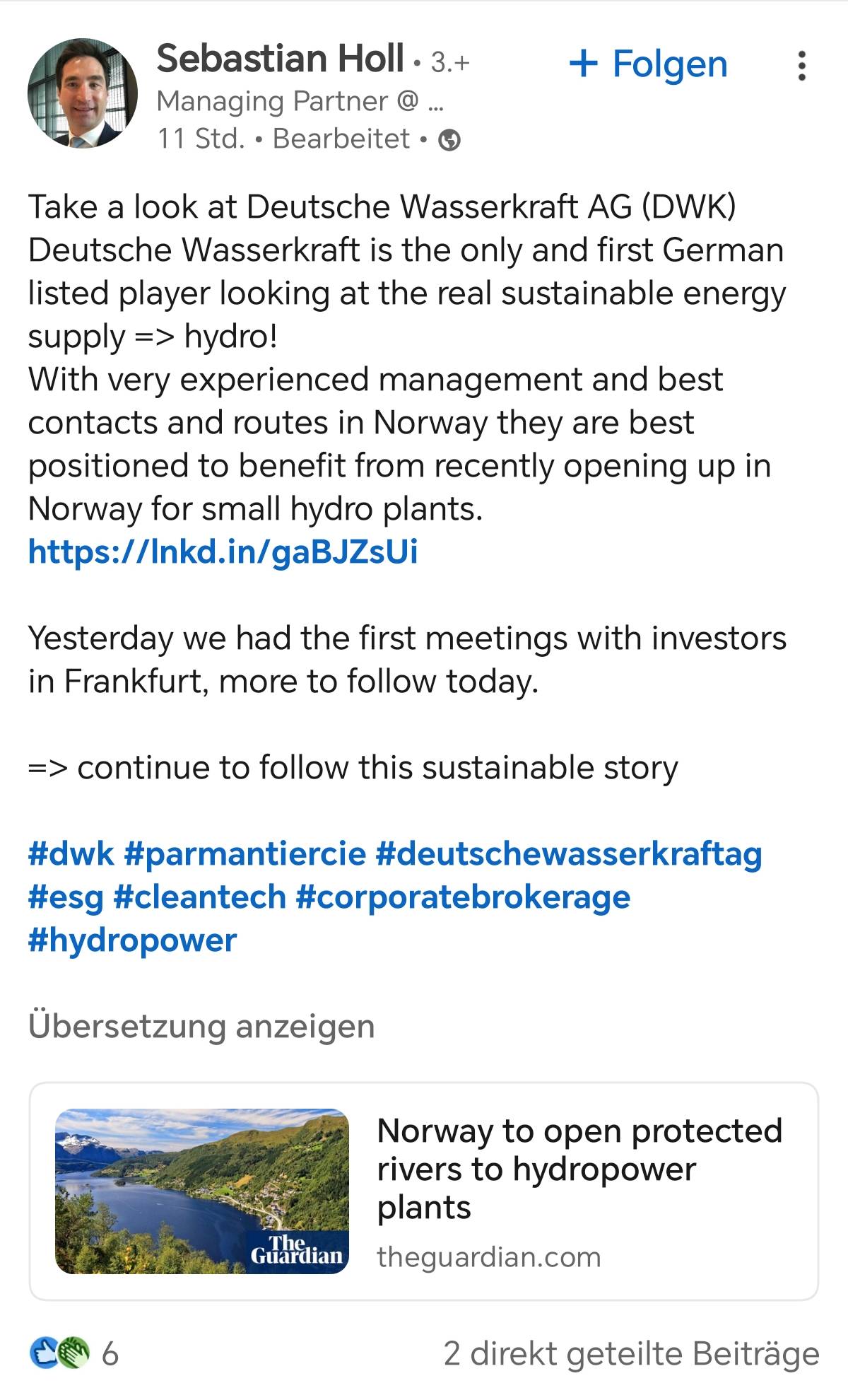 Zudem könnte der vor einigen Wochen bekannt gegebene Deal mit Odel Energy AS längerfristig zum Bau von 10 bis 20 Wasserkraftwerken im Volumen von bis zu 50 Mio. EUR in Norwegen führen, wofür die DWK u.a. das Eigen- und Fremdkapital beschaffen wird.