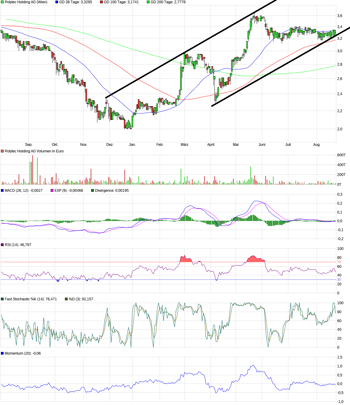 Ausbildung einer Unterstützungslinie durch Dreifachtief bei 2,90 Euro. 38-Tagelinie und 200-Tagelinie wurden zurück erobert. Nächstes Ziel sollte die Überwindung des Jahreshochs bei 3,65 Euro sein.