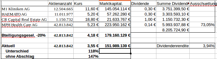 Da jetzt die Dividende von 1 Euro bekanntgegeben wurde, hier mal die Tabelle, wenn MPH ihre Ausschuettung beibehaelt