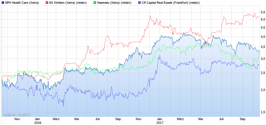 ,dass der Kursverlauf von MPH nahezu deckungsgleich mit Haemato ist. Der Haemato-Anteil aber im MPH-Portfolio lediglich auf einen Wert von etwa 68 Mio. € kommt. Wobei der M1 Kliniken-Anteil fast 141 Mio. € beträgt. Und somit größer ist als die Marktkapitalisierung von MPH mit 139 Mio. €.