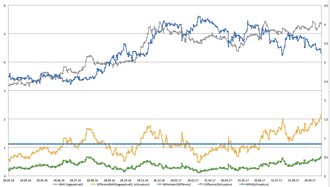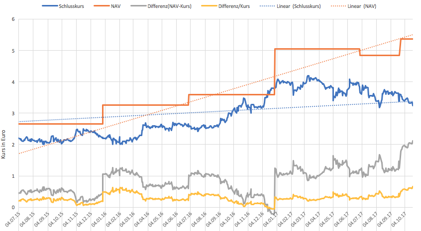 In der Vergangenheit - 2015 und 2016 - war der Abstand zwischen dem Kurs und dem NAV relativ gering und wurde sogar zum Jahresende 2016 aufgeholt.
