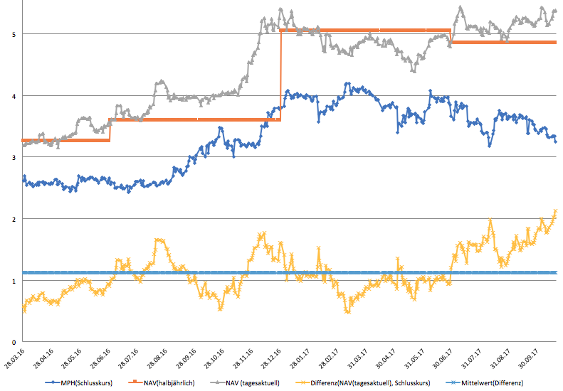 Wie man sieht, verhält sich der Aktienkurs von MPH ähnlich dem Verlauf des NAV mit den tagesaktuellen Kursen der Beteiligungen. Jedoch divergieren die beiden Verläufe seit etwa Juni.