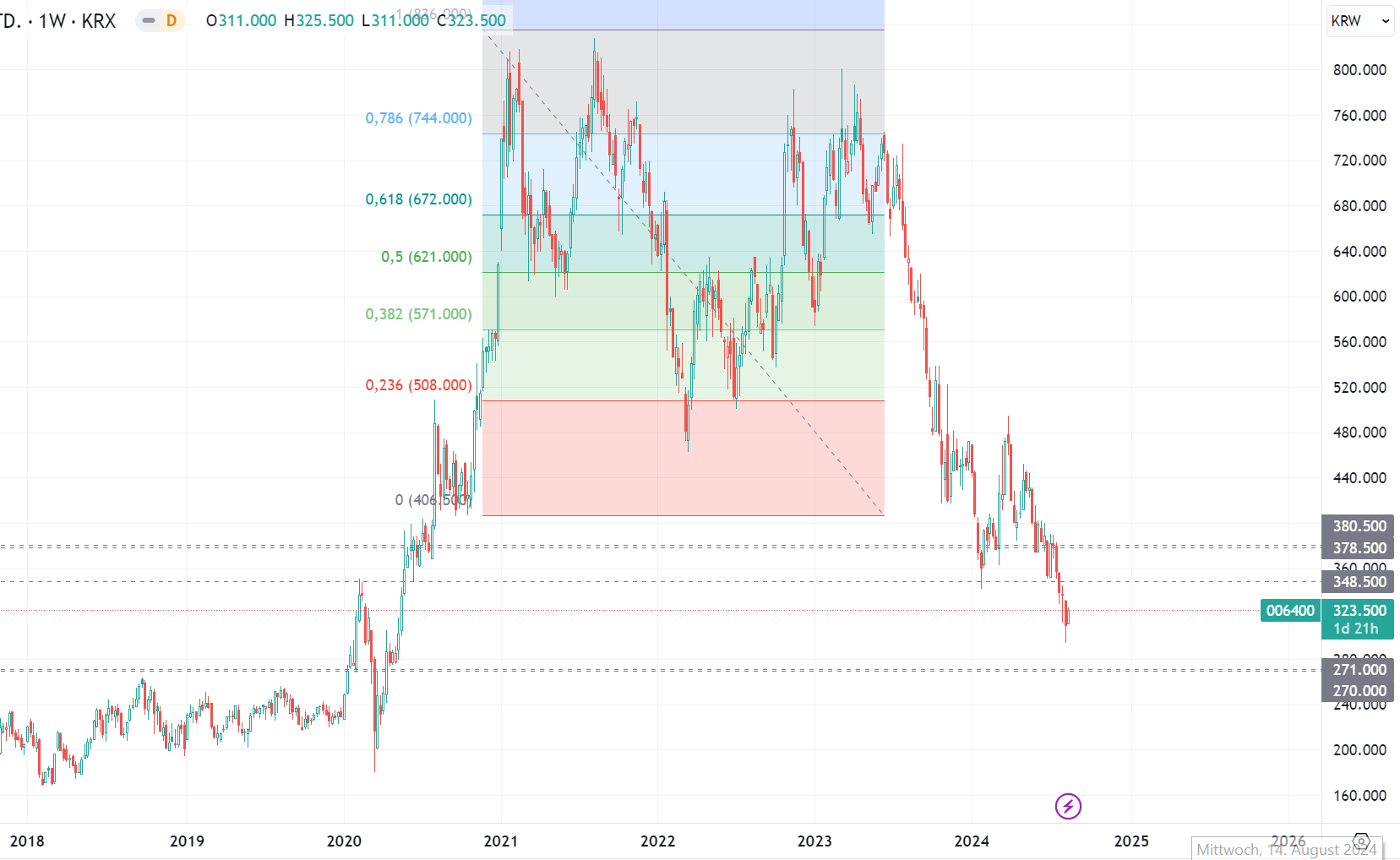 die wir außerhalb dieses Fadens diskutiert haben. Die Linie, das sieht man hier kaum, ist ein paralleler Kanal 270´ - 271´ KRW. In Abhängigkeit dessen, wie sich der Kurs im Verhältnis zu dieser Marke verhält, sollte man das erste mal beurteilen können, ob das für einen Boden herhalten kann.