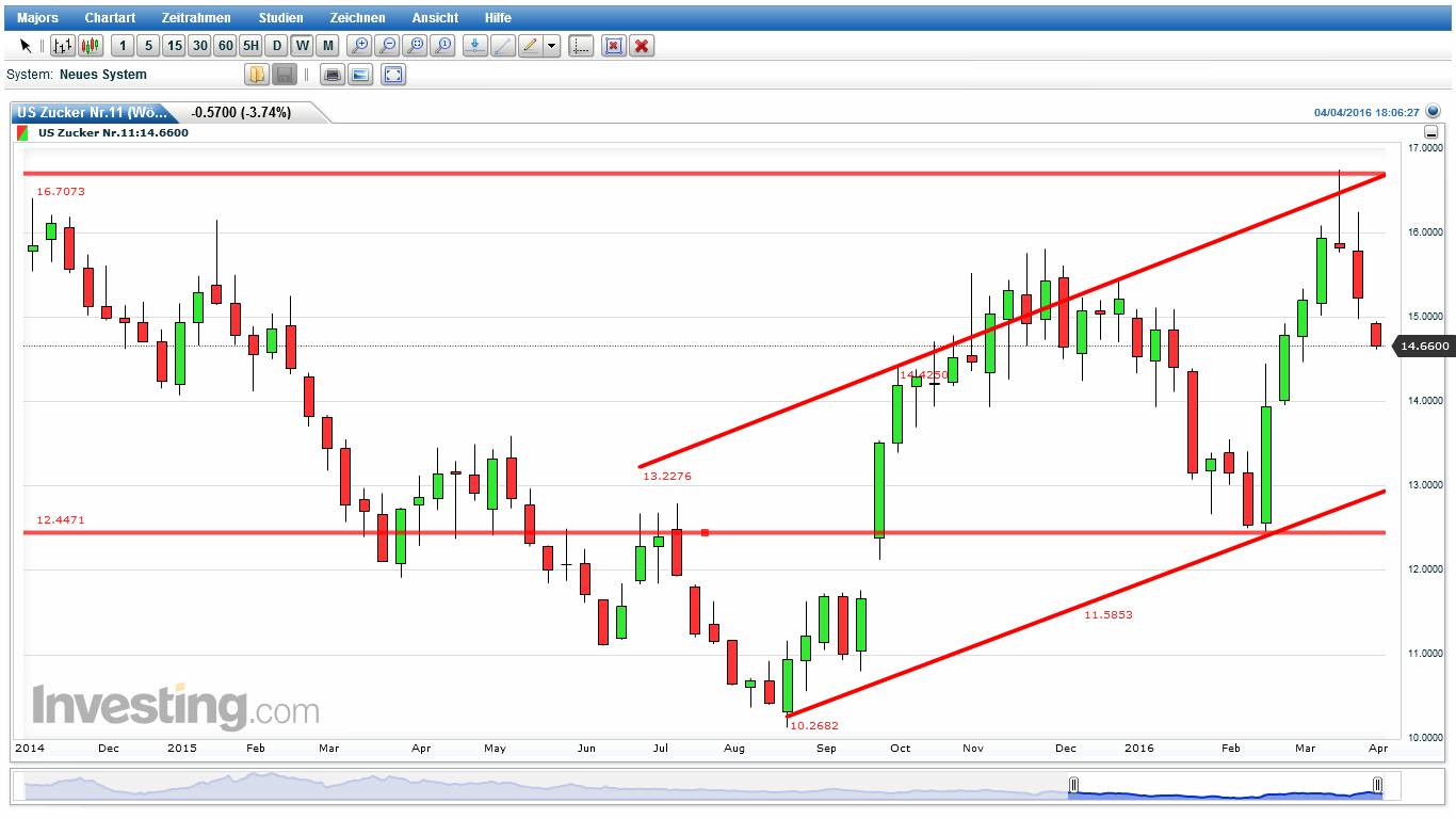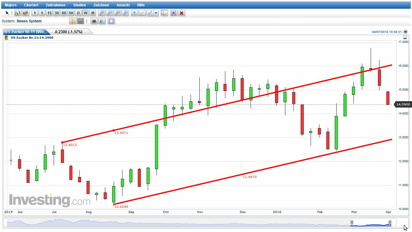 der Zuckerkurs wird bis ca. 14,60 ct zurückkommen. Spätestens in diesem Bereich wird er wieder nach oben drehen. Ich bin wieder eingestiegen bei 15,10 ct.