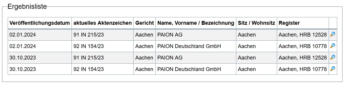 Wie es aussieht, ist Paion noch immer in der Phase "vorläufiges Insolvenzverfahren"