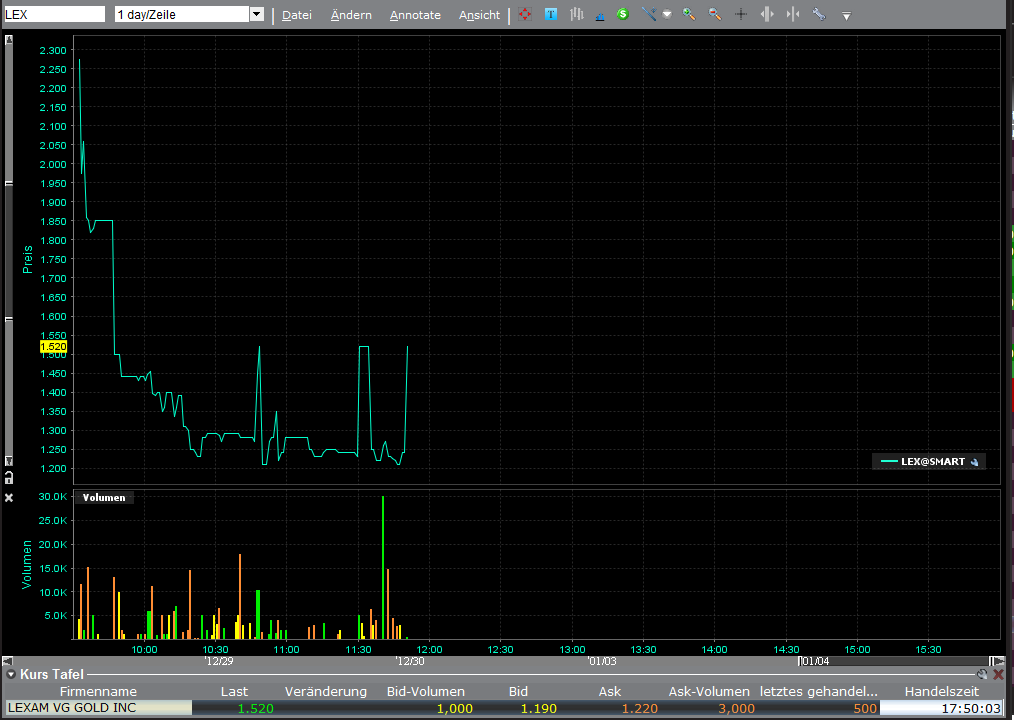 04.01.2011 17:44 New Lexam and VG Gold to Trade on TSX and OTCQX Under ''LEX'' and ''LEXVF'' TORONTO, ONTARIO -- (Marketwire) -- 01/04/11 -- Lexam VG Gold (TSX: LEX)(OTCQX: LEXVF) is pleased to announce that the combined companies' shares have begun trading on the Toronto Stock Exchange (TSX) and the OTCQX under the tickers LEX and LEXVF respectively. The new Lexam VG Gold's transfer agent will now be Computershare Investor Services.