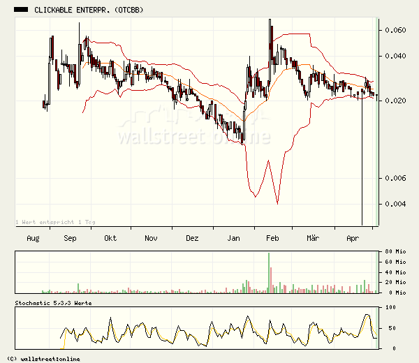 ..,ist ein typischer Wert, wo man Geduld haben muss. Die Aktie dümpelt vor sich hin, gib leicht nach, aber irgendwann kommt dann immer der Sprung nach oben, ist halt nur die Frage wann. Wer es sich leisten kann, etwas länger dabei zu sein und zu warten, kann dafür sehr gut belohnt werden. Die Indikatoren für Clickable drehen ins Positive, vielleicht kommt hier bald der Ausbruch!