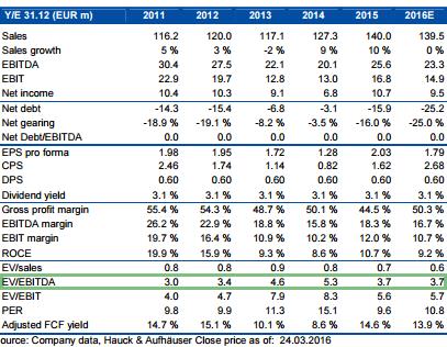 "Sollten die Berliner ihre Ausblicke für 2015 und 2016 tatsächlich einlösen eine positive Überraschung wäre dabei noch nicht einmal unbedingt nötig , wäre das aktuelle Kursniveau eine feine Einstiegsbasis. Eine derart günstige Kennzahlenkombination gibt es nicht so häufig auf dem heimischen Kurszettel. Auf Zwölf-Monats-Sicht hat der Titel inklusive der Dividende dann vermutlich locker ein Potenzial von 20 Prozent. Die Kursziele der Analysten sind sogar noch weiter von der aktuellen Notiz entfernt. Die WGZ Bank sieht den fairen Wert bei 26 Euro, Hauck & Aufhäuser nennt gar ein Ziel von 28 Euro für den Small Cap. Zudem gilt das Unternehmen als Profiteur eines gegenüber dem Euro festen Dollars."