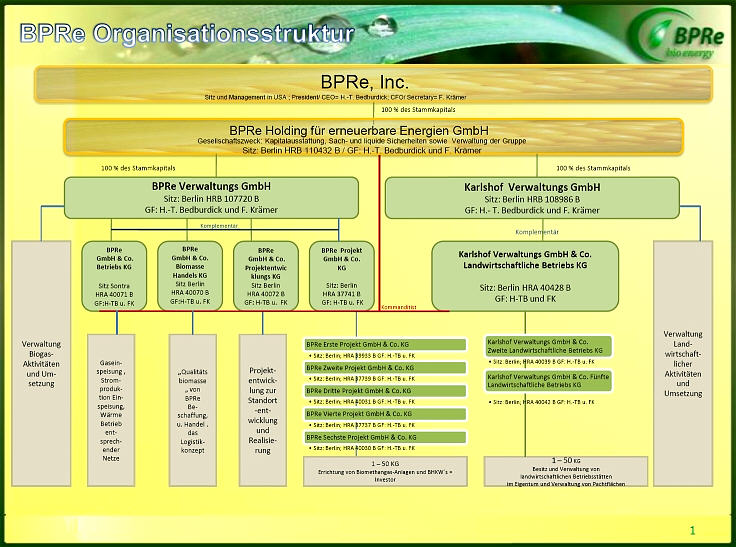 Bemerkenswert ist eine neue Aktivität in Nordhessen, wo in Wahnfried landwirtschaftliche Flächen bearbeitet und Biogas erzeugt werden sollen. Mit der neuen Karlshof Verwaltungs GmbH & Co Landwirtschaftliche Betriebs KG will BPRe offensichtlich der KTG nacheifern.