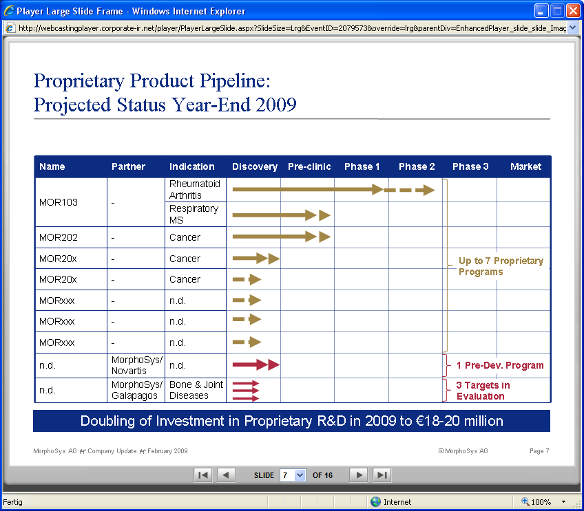 Bezüglich der Publicity von klinischen­ Partner-Pr­ojekten hast du nur eingeschrä­nkt recht. Die publicity macht MOR nur selbst in den frühen Phasen, die Pharmas lassen da noch nichts raus:
