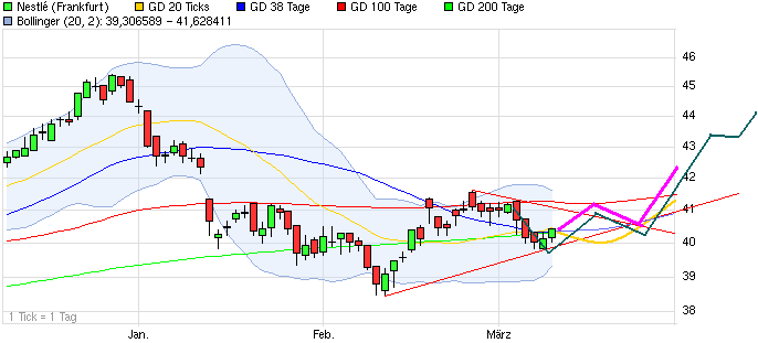 Also ich geh davon aus, dass nach überschreiten des GD 20 (gelbe Linie) der GD 38 (blaue Linie) noch geknackt wird und sich daraus ein Aufwärtrend bis zum 100er Durchschnitt (rote Linie) entwickelt. Damit wäre der Widerstand des Wimpels geknackt und der Kurs könnte bis 25. März bei €40,55 an GD 20 konsolidieren.... als Unterstützung fungieren dann GD 20 und untere Wimpellinie .... pfalls das so kümmt erwarte ich Ende März die Vollendung einer W-Formation deren Fähnchen im April für weiteren Auftrieb sorgen....