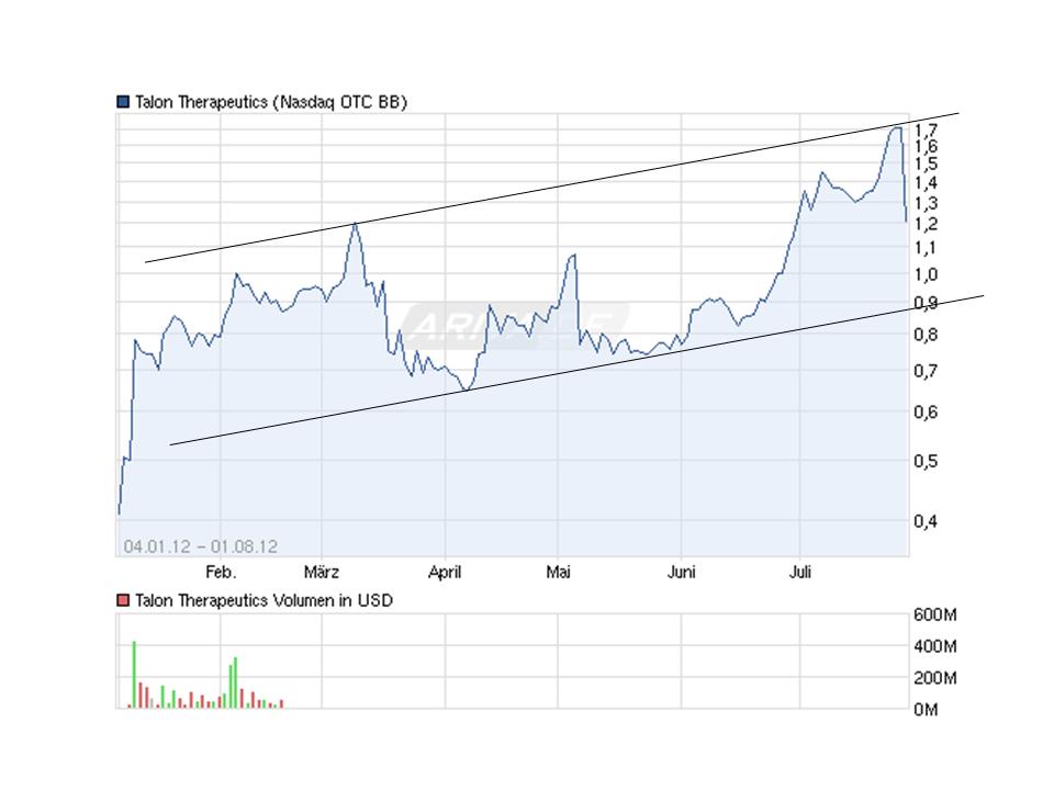 Von wegen ohne Grund: Ein langer und sehr fundierter Artikel auf Seeking Alpha stellt dem Talon-Management in Bezug auf die durchgeführten Kapitalmaßnahmen mit Warburg Pincus und Deerfield ein verheerendes Zeugnis aus. Kurzgesagt droht den Besitzern der Common Shares eine Verwässerung durch 300 Mio Shares nach Wandlung der preferred sowie keinerlei Mitsprache bei Entscheidungen der Geschäftsleitung. War zwar alles bekannt, aber in dieser agrumentativ eloquenten Gesamtschau ein Schlag ins Kontor. Bei einem so marktengen Titel hat das gereicht. Von wegen Charttechnik.