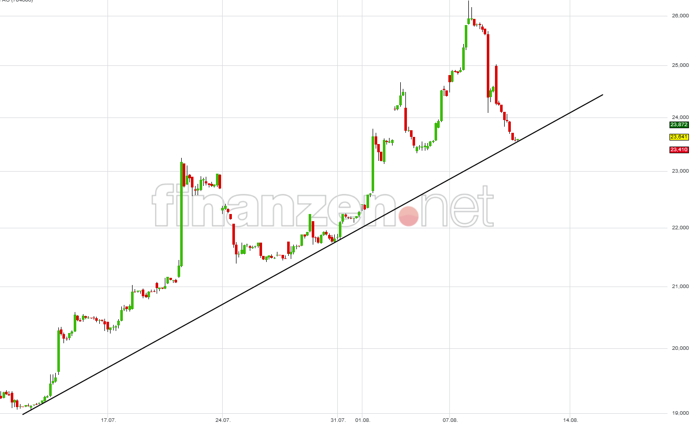 Kurzfristiger Aufwärtstrend Wie ich angenommen­ hatte ist der kurzfristi­ge Aufwärtstr­end gerissen. Sollte die Stützungsz­one bei 22,84 / 22,73 nicht halten sehe ich als nächsten Stop den Bereich um 20,96 / 20,66.