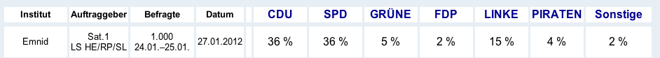 Und die Piraten haben nach ihrem Achtungserfolg von 8,9% in der Umfrage auf 14% ausgebaut.