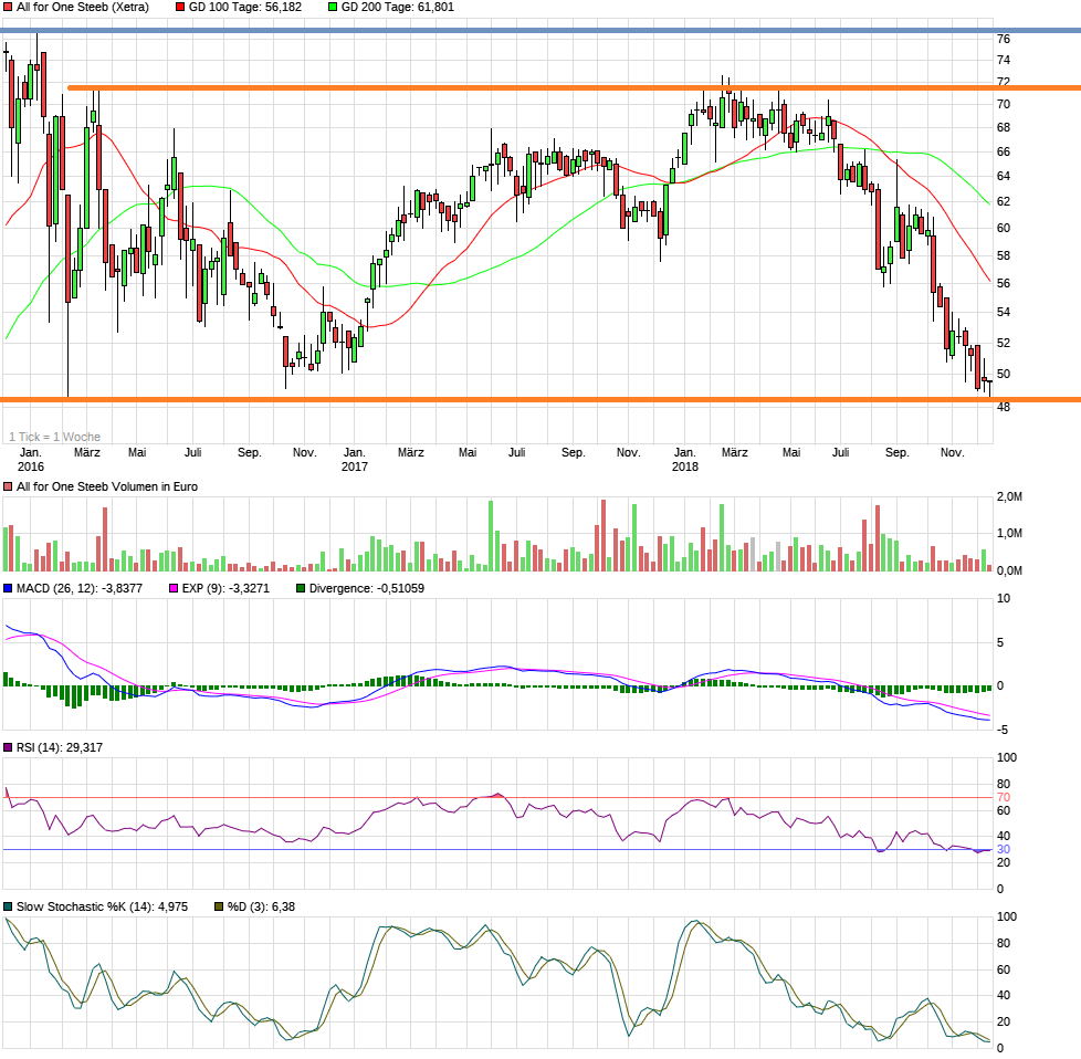Man ist an den Tiefs bei rund 48,2 € der letzten 3-4 Jahre angekommen, und zudem Indikatoren zwar noch mit keinen Kaufsignale, aber doch auf einem Niveau, wo mal eine Gegenbewegung anstehen könnte. Könnte bis 55-56 € gehen. Allerdings darf man nicht unter 48 € fallen. Sonst wären auch 40-42 € als Korrekturziel denkbar.