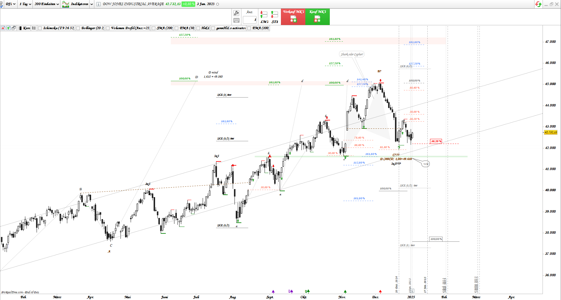 Rücklauf seit dem 04.12 fand zunächst auf der 0,382 Retracement, Tief Apr 2024 und Hoch Dezember 2024 eine Unterstützung=> so gesehen eine „leichte Korrektur“.