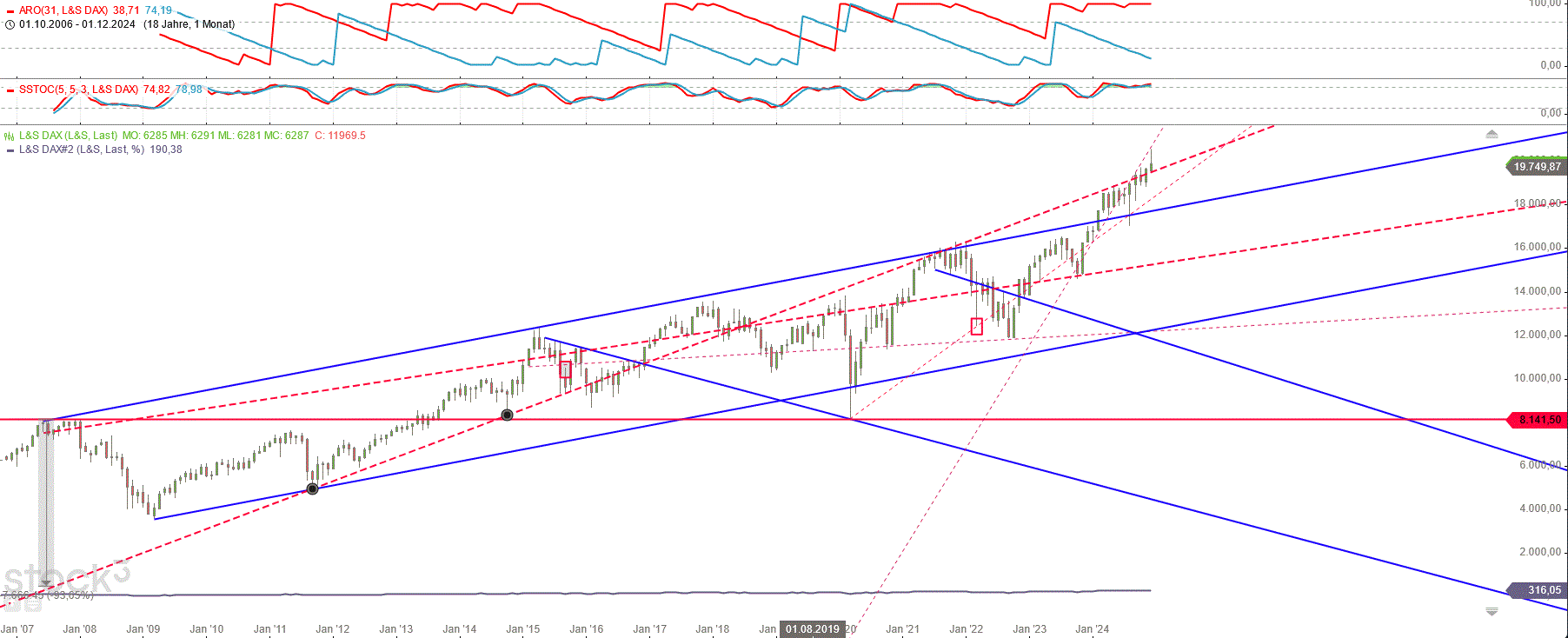 Wie ich bereits sagte, müsste nach den Armstrong-Zyklen eine Schwächephase bis 2028 anstehen, und ein Blick auf die US-Charts würde das auch sehr wahrscheinlich machen. Etwas unpassend ist ja in seinen Meilensteinen, dass der Abschwung jeweils viel zu früh angesetzt ist, zB. 2007, und länger dauert als in der Realität. Man weiß ja, dass Korrekturen meist viel kürzer und schärfer verlaufen als Rallys. Und mein Eindruck ist, dass das Verhältnis durch die Manipulation der Notenbanken immer extremer wird. Ich habe das in 2020 leidvoll erfahren müssen, als ich zunächst zu früh einstieg, und teilw. per SL wieder rausflog, und dann den Absprung großteils verpasst habe.