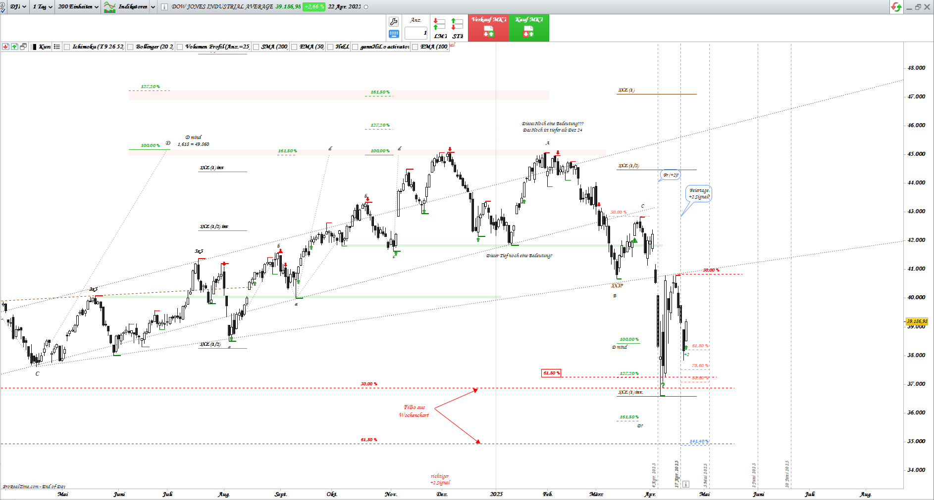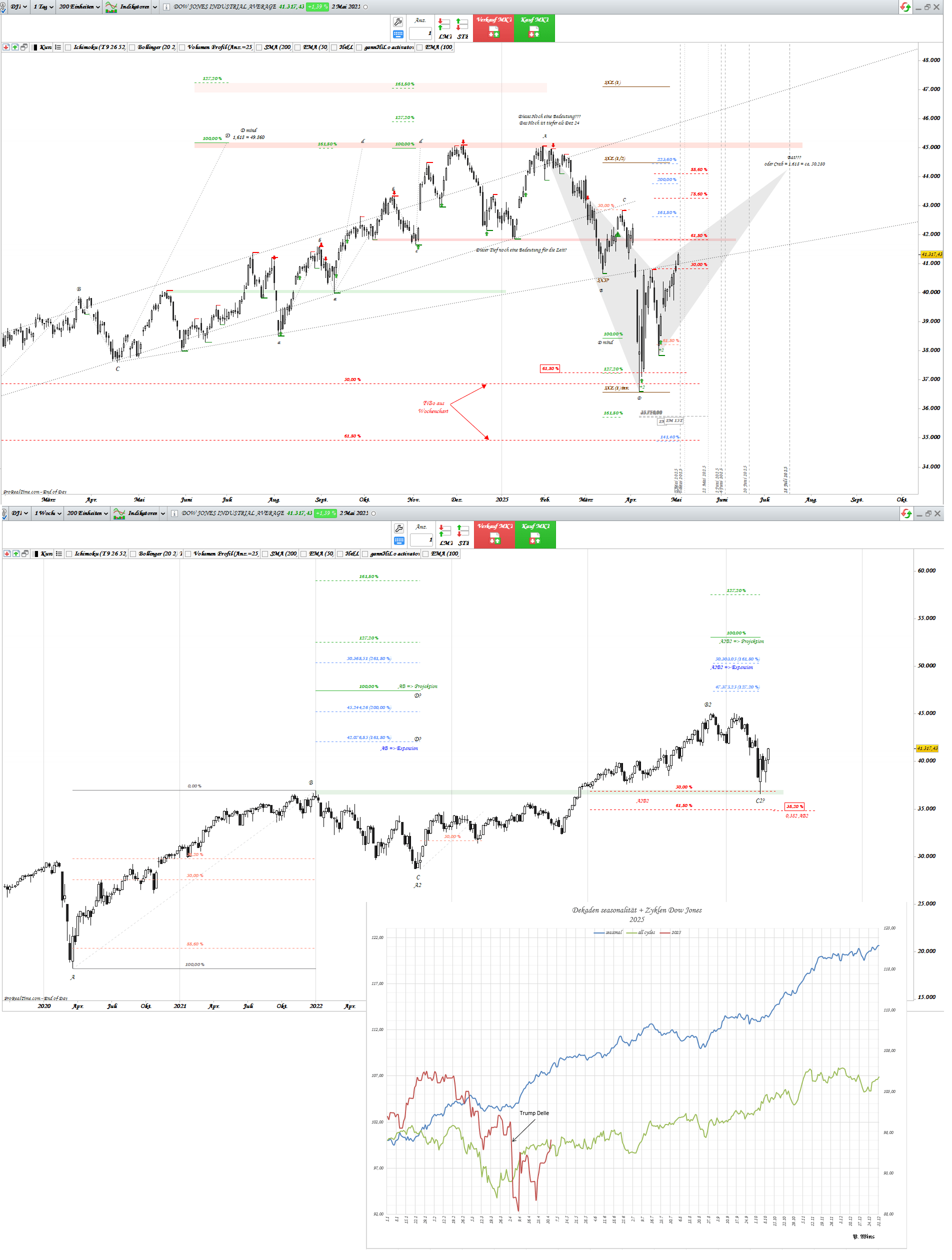 Aber, bevor Dow zu den Zielen schnellen kann, hat er noch paar Hürden zu bewältigen. Vor der ersten steht ja schon: 0,618 FiBo. Dort auch gleichzeitig Widerstand aus den Tiefs Okt. 2024 und Januar 2025. Zudem, gleich zum Wochenbeginn, liegen Signaltage vor: 05.05 und 07.05. Welches Ereignis haben wir am 07.05? => US: Fed-Zinsentscheid.... Na dann schauen wir mal, mit welchem Zeichen kommt Dow aus den Signaltagen raus.