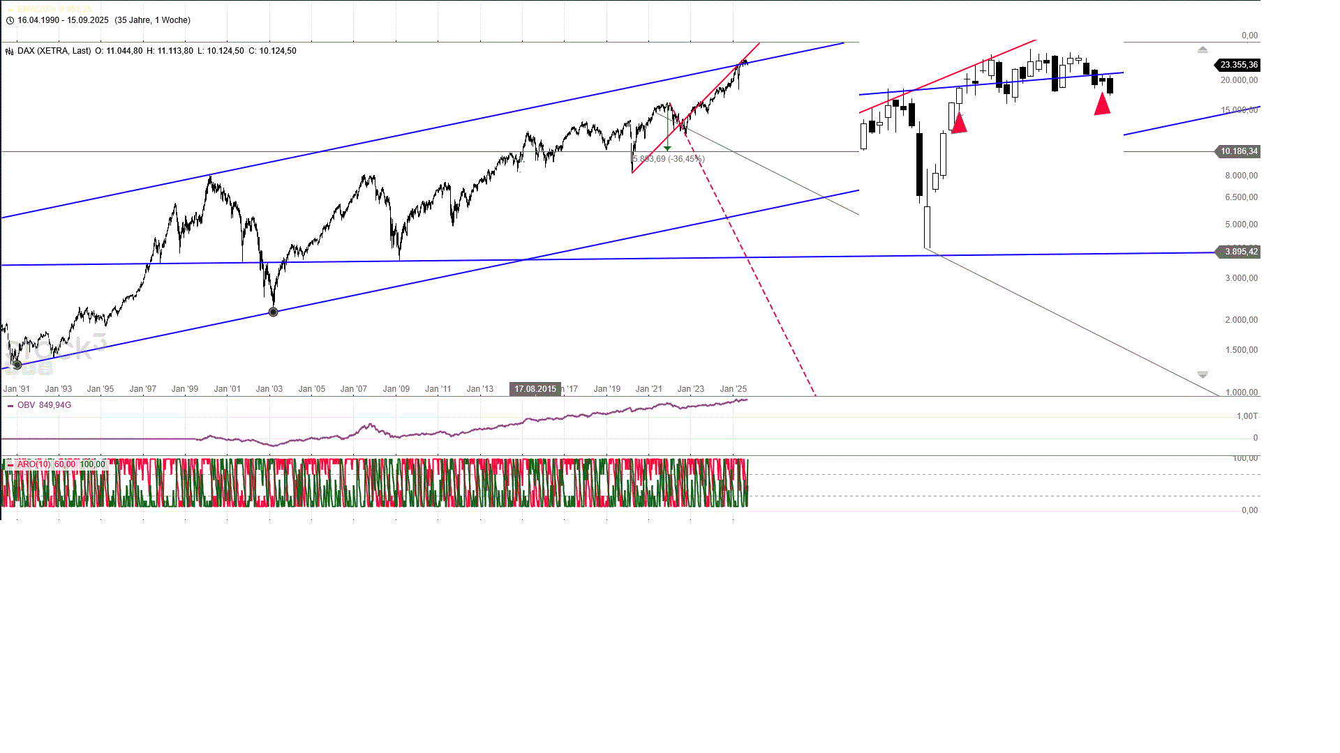 Dax Weekly Ob das nur ein Zufall ist? Habe die untere Linie angelegt und nach oben kopiert..  Sollt­e der Kurs bis zur unteren Trendlinie­ fallen wird es in Deutschlan­d und auch in der EU bestimmt nichts positives zu vermelden sein. Robbi, was könnte so ein Szenario auslösen? Da fällt dir bestimmt was ein;-))