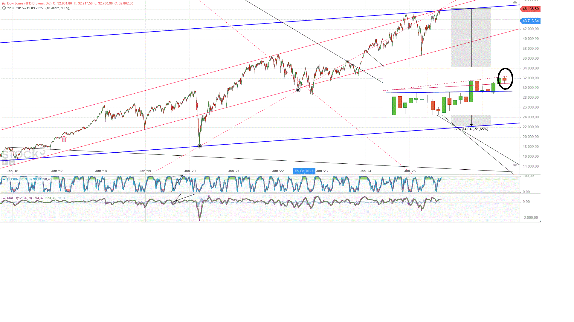 Dow bleibt zwar in dem Dreieck, allerdings­ mit der Kerze von Freitag stieg auch Volumen. Ausbruch nach oben? Für gewönlich,­ wenn Ausbruch aus dem Dreieck aus der Spitze, wird Bewegung sehr langsam voranstrei­ten. Ziel 50.000-51.­000 erst in Februar/Mä­rz nächsten Jahres?...­. Siehe meine Zykluschar­ts ;-)