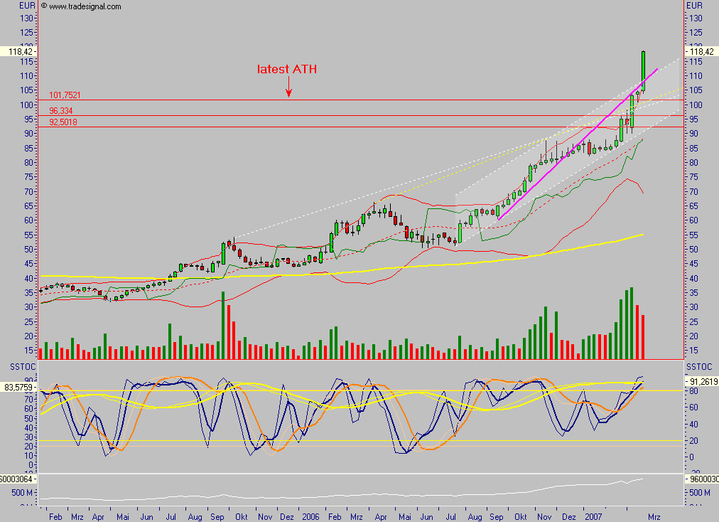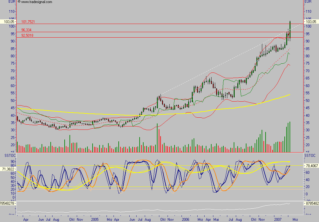 Das stimmt wohl, charttechnisch ist der jetzige Ausbruch schön anzusehen. 3 white soldiers unter hohem Volumen stellen ein starkes Kaufsignal dar, das macht stutzig. Ich bleibe zwar dabei, die 100 werden wir auf jeden Fall in Kürze sehen, aber ich warte auf eindeutige Umkehrsignale. Viel ist hier natürlich auch weiterhin vom Gesamtmarkt abhängig.