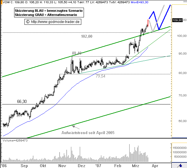 Rückblick: Die VOLKSWAGEN Aktie setzt in den letzten Tagen ihren langfristigen Aufwärtstrend fort. Dieser Trend startete im März 2003 und wurde im April 2005 massiv beschleunigt. Am 09.03.2007 durchbrach die Aktie erstmals ihr Allzeithoch bei 102,00 aus dem Juli 1998. Am 14.03.2007 kam es zwar noch einmal zu einem kurzen Rückfall unter dieses Hoch, aber dieser wurde sofort an der alten oberen Begrenzung der Aufwärtsbewegung seit April 2005 aufgefangen. Nur einen Tag später stieg die Aktie wieder über die Marke bei 102,00 Euro an. Seitdem setzt sie sich nach oben ab, besonders im heutigen Handel.