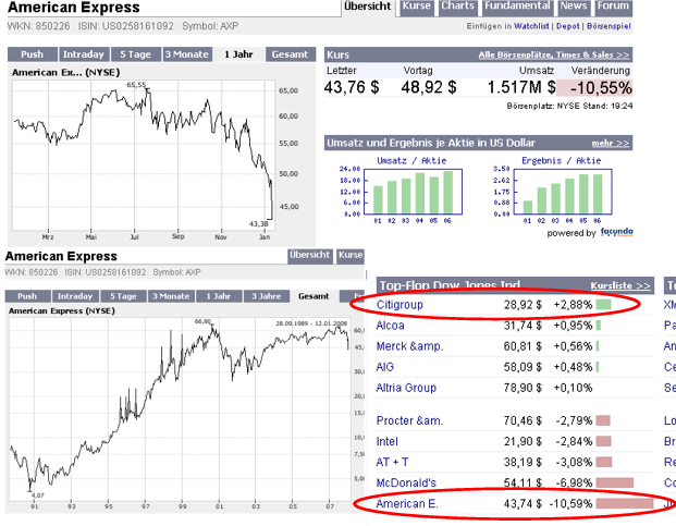 In der kommenden Woche legen die Citigroup und andere große US-Finanzkonzerne ihre Jahreszahlen vor. Dabei werden weitere Milliardenabschreibungen infolge der Hypotheken- und Kreditkrise erwartet. Die Citigroup rechnet für das vierte Quartal bislang offiziell mit Abschreibungen von bis zu elf Milliarden Dollar durch Wertpapiere auf Basis schwach besicherter Kredite ("subprime"). Nach Einschätzung von Analysten könnten sie auch deutlich höher ausfallen.