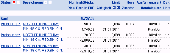 Wenn Ihr 'mal einen Blick auf das VOLUMEN werft, das in denen letzten Tagen zwischen denen beiden Curs-Marken (also zwischen 0,090 und 0,099 €uro) eingesammelt wurde, so liegt dasselbe doch eindeutig HÖHER als die 440 Stücke, die ich inzwischen insgesammt habe; und mein größter (und bislang letzter) Einkauf vom gestrigen MITTWOCH (12.1.2010) erreichte auch nur ein Volumen von 100 (siehe das PHOTO).