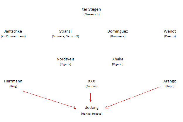 bildliche Darstellung... 4-2-3-1.. X= neuer Verteidigungsspieler XXX = der 10´er....