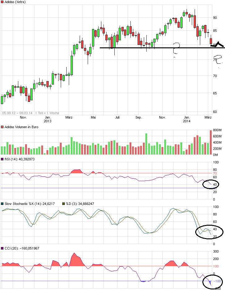 Heute hat man ziemlich deutlich gesehen, dass die 80 € Marke für den Kurs scheinbar schon ne Bedeutung hat…heute Vormittag wurde Sie unterschritten (zahlreiche Stopps gerissen, vermutlich weil einige Privatanleger den Empfehlungen von godmode folgen), allerdings wurde der Kurs relativ schnell wieder bis knapp an die 80er Marke geschoben, lief dann auf diesem Niveau seitwärts, danach ging der Kurs leicht nach oben und wurde dann aber recht schnell wieder abverkauft bis wieder in den Bereich von 80 €…für den langfristigen Verlauf finde ich diese Marke ebenfalls bedeutend, deutlich drunter sollte man nicht gehen,wenn man den langfristigen Aufwärtstrend halten will…allerdings ist das momentan alles recht instabil das Ganze