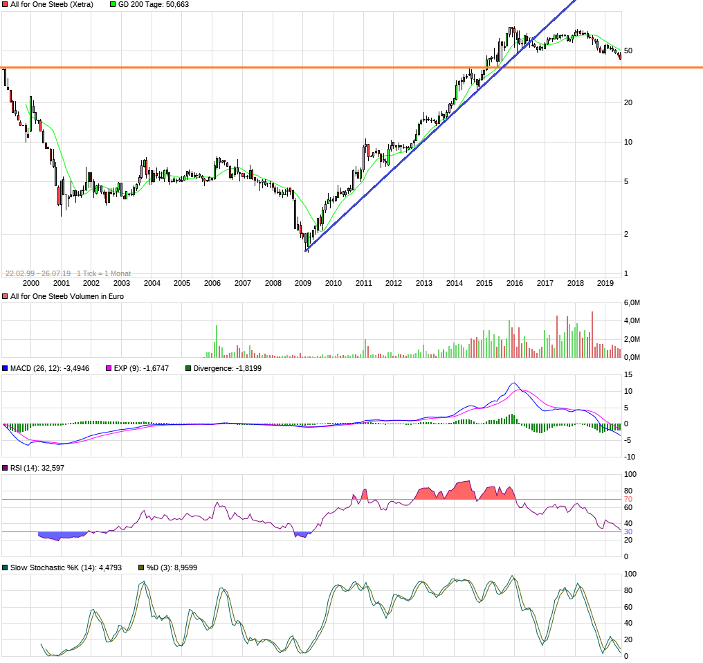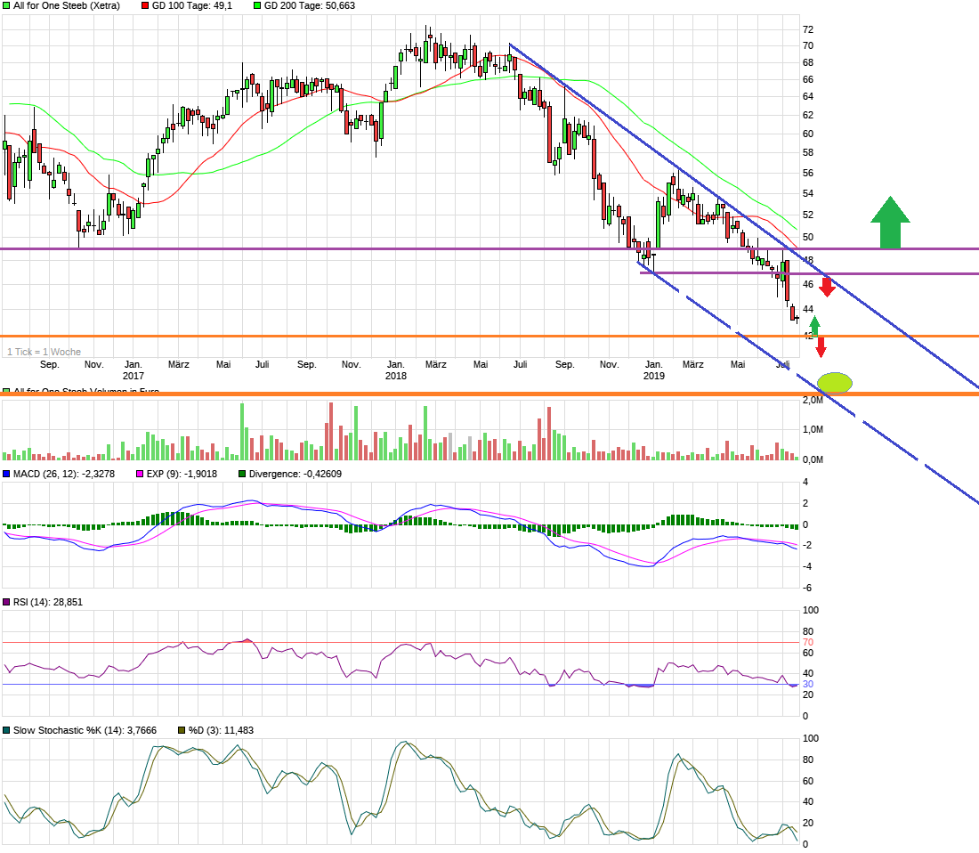 Jedenfalls würde ich im Weekly schon ein wenig auf diese 37 € im September/Oktober spekulieren. Könnte das antizyklische Tief für die nächsten Jahre werden. Prozyklische Käufe bieten sich eigentlich erst wieder mit Überwinden der 49 € Marke an. Da dürften dann nicht nur die horizontalen Widerstände bei 47 und 49 € überwunden sein, sondern auch Abwärtstrend und dann auch im Oktober die 100+200TageLinie, die aktuell noch steil fallen.