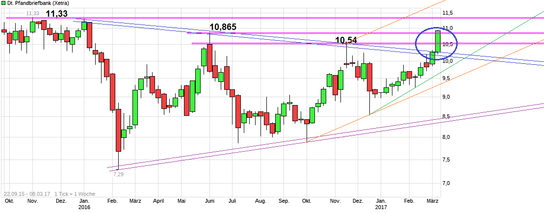 Tja, das sieht ja richtig freundlich aus. Gute News + gute Chartsignale. Die News, daß es nun doch die Sonderdivi in voller Höhe geben wird, hatten viele Leute wohl nicht mehr so wirklich auf dem Schirm, nachdem die schlechte News Mitte Dezember kam ( Streit, ob man für ausgelagerte Kredite der HRE haften muß in dreistelliger Mio. Höhe =>http://www.ariva.de/news/...-altlasten-statt-dividendenfreude-5980287 "...Sollte der Gutachter den Fall in den nächsten drei bis vier Monaten negativ entscheiden, lässt sich dies laut Häßler allerdings mit positiven Sondereffekten verrechnen. Die Pfandbriefbank hatte nach einer Einigung mit der österreichischen Abwicklungsanstalt der Hypo Alpe Adria, Heta, im Streit um Anleihen einen Vergleich angenommen. Aus diesem fließen ihr 132 Millionen Euro zu. "Das würde jedoch bedeuten, dass die PBB nicht in der Lage wäre, die aus dem Vergleich in Aussicht gestellte Sonderdividende zu zahlen", ...). Da ist ja bislang noch kein Gutachterspruch öffentlich bekannt geworden. Aber die Zeit von 3-4 Monaten bis zur Entscheidung nähert sich nun langsam dem Ende zu und die Entscheidung die volle Sonderdivi auszuschütten könnte (hoffentlich) ein vorgezogener Wink mit dem Zaunpfahl sein, daß die PBB nicht dafür gerade stehen muß. Würde ein solcher Spruch mit positivem Ausgang bald verkündet, dann könnte die Aktie nochmal einen Hüpfer machen. Nächster horizontaler Widerstand länge aktuell bei 11,33€. Sollte es wider erwarten ein Spruch gegen die PBB geben, dann würde es erneut viele Leute auf dem falschen Fuß erwischen, die nach der heutigen Meldung zur Sonderdivi die Sache eigentlich schon als so gut wie erledigt gesehen haben für die PBB. Dann könnte das heutige Eröffnungsgap nochmal in den Fokus rücken. Alternative wäre es erst durch den kommenden DiviAbschlag nach der HV dann erst wieder zu schloeßen ;)