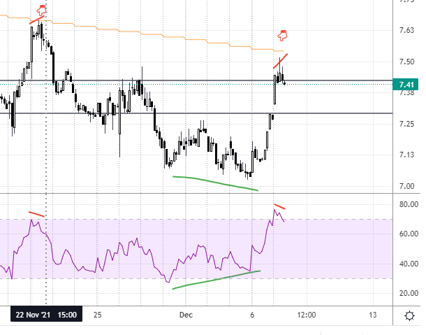 Wie gesagt: Dezember ist kein gutes Mionat, daher die erwartung ist, dass die SMA 50 bleibt als "Deckel", die Bullen werden geschlachtet, der Bereich 7,40-7,30 bleibt Wiederstand, es wird (weit) unten die 7 fallen (Szenario II).