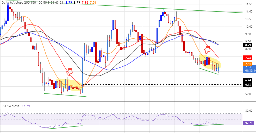 Aber SMA50 momentan bei 7,50 daher galube ich, dass alles von einem Pullback spricht bis 7,55 und dann müssten wir ein erneutes Abwärts-Leg sehen...