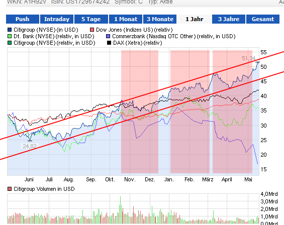 ProfNova: Hier eine ehrliche Antwort. Um das Ergebnis der Citigroup mit Aktien zu toppen, musste ich 20.000 BAC einsetzen, im Vergleich zu - kurzfristig - 4.000 Citigroup, denn mit beiden Papieren kamen jeweils rund 35.000,-- Euro Kursmehrung zustande. Früh genug hatte ich erkannt, dass die Citigroup (in 2013) zunächst einmal besser vorankäme, so die Meinung, die sich nun bestätigte. Bei den BAC schwingen noch die älteren Bestände ( =t 8.000 Stück) mit, die teils im Verlust lagen. Also, beide US- Großbanken sind aktuell noch vorauss. für einige Monate im Auf, so meine Vermutung, denn erst jetzt werden die besseren Ergebnisse - eher unbelastet - bekannt, wie auch die Niedrigzinspolitik von FED banktechnisch Früchte trägt. Macht derzeit bei mir gut = 70.000 Euro Kursgewinn; vll. dann bald auf 140.000 Euro Kursgewinn hinauf - siehe folgend - :