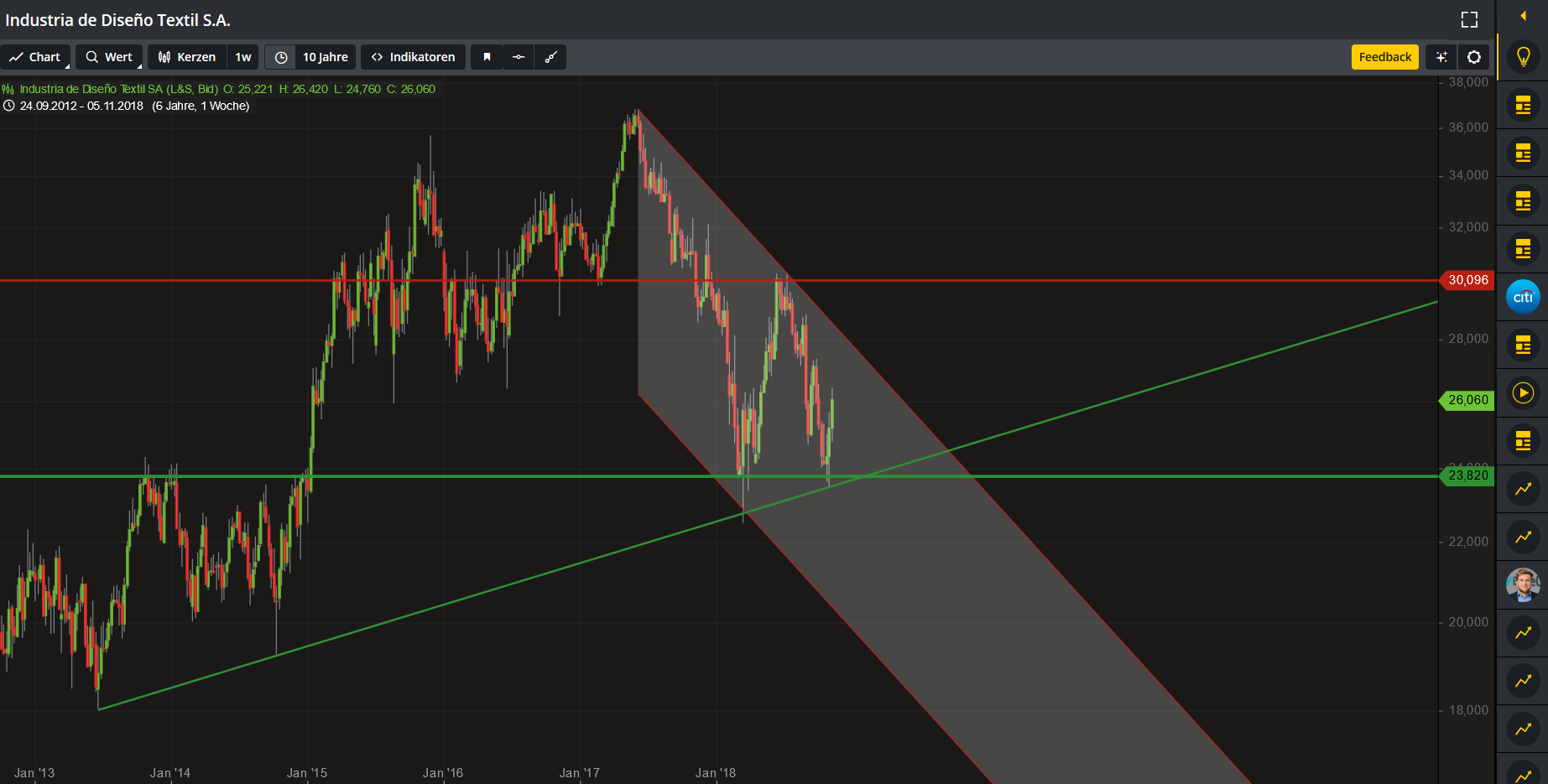 Aktien von Inditex (Inditex Aktie) sind im Handelsverlauf am Freitag auf ein Rekordhoch gestiegen. Zuletzt gewann die Aktie 0,5 Prozent auf 53,36 Euro. Im bisherigen Jahresverlauf hat der Wert 36 Prozent gewonnen und damit den breiten Markt deutlich hinter sich gelassen.