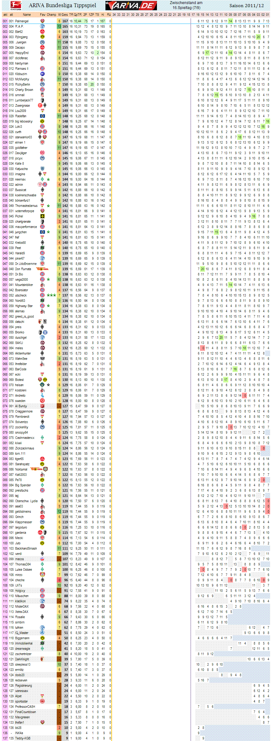 Die Übersicht der Partien des 16.Spieltages der 1.Bundesliga, Saison 2011/12 zum tippen: